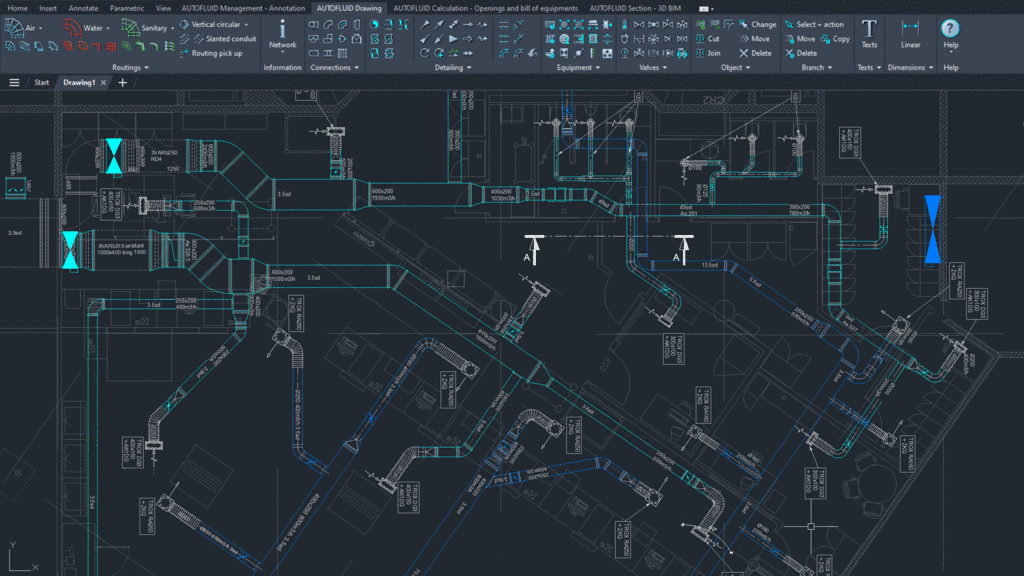 > AUTOFLUID is the specialist application for drawing 2D network plans. Effortlessly create high-quality plans: every element is perfectly designed and positioned to ensure the best understanding and reduce the risk of error during installation.